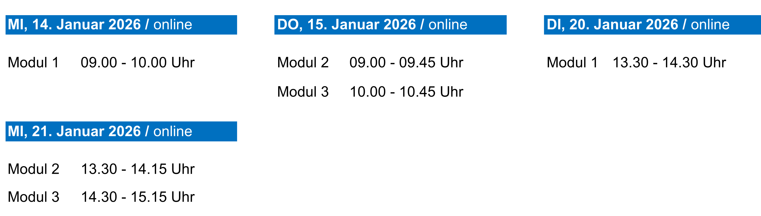 Die Schulung wird in drei Module unterteilt werden. Sie haben die Möglichkeit, sich für einzelne, mehrere oder für sämtliche Module anzumelden. Bitte beachten Sie die verschiedenen Modulzeiten auf dem Anmeldetalon.