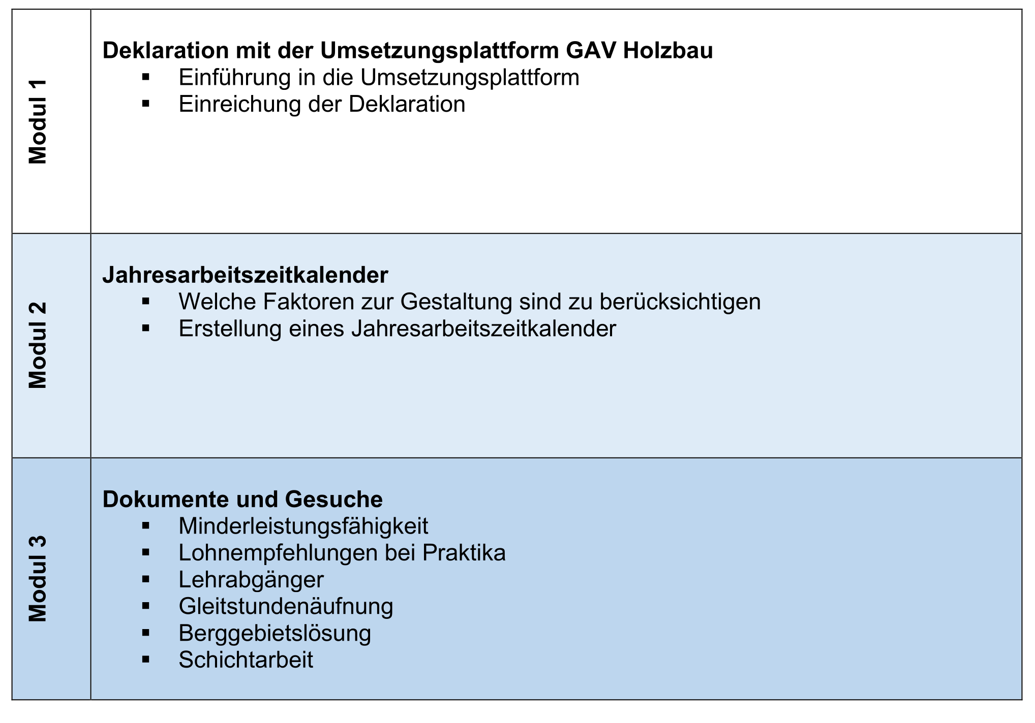 An dieser Schulung wird das Augenmerk auf die Funktionalitäten der Umsetzungsplattform GAV Holzbau gelegt. Dies umfasst unter anderem die Einstufung der Mitarbeitenden sowie die Berechnung der Erfahrungsjahre. Weiter werden die für die Umsetzung des GAV Holzbau sowie die Führung des Betriebes nützlichen Formulare und Vorgänge, wie beispielsweise das Erstellen eines Arbeitsvertrages thematisiert. Abgerundet wird das Programm mit aktuellen Informationen zum GAV-Vollzug.